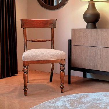 Silla comedor clasica con respaldo y asiento tapizado en tela beige, fabricada en madera de haya y tallada a mano.